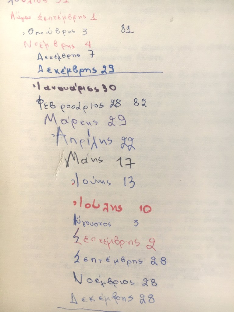 H ιδιοκτήτρια του βιβλίου που αγόρασα για 1 ευρώ ίσως ασχολήθηκε αργότερα με το εμπόριο και την επισκευή μουσικών οργάνων, το μόνο που σίγουρα γνωρίζω για εκείνη είναι οι ημερομηνίες που άρχιζε η εμμηνορρυσία της, όπως τις σημείωσε στην τελευταία σελίδα του βιβλίου (από το Σάββατο 27 Ιουνίου 1981 μέχρι τον Ιούνη-Ιούλη-Αύγουστο 10 του 1983).
